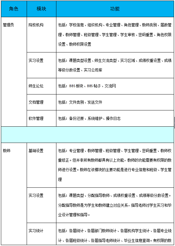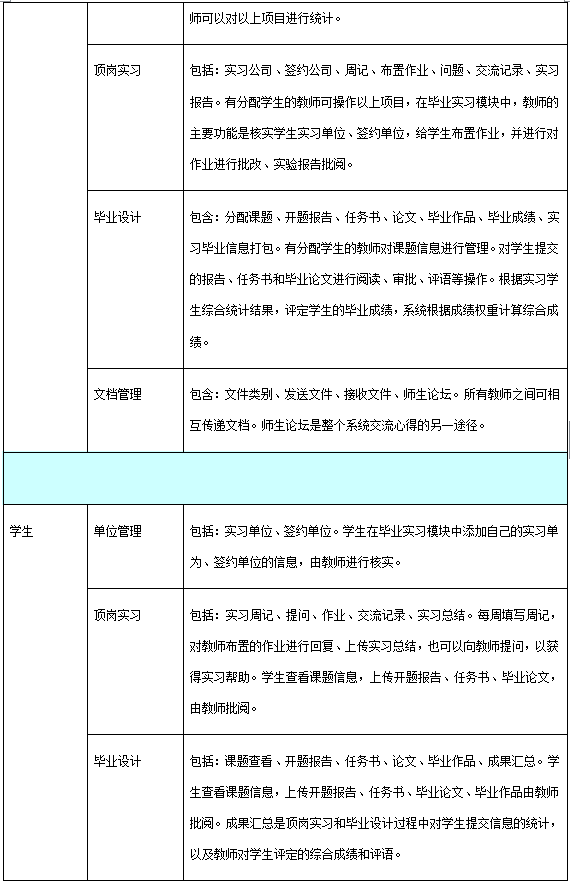 軟(ruan)件按管(guan)(guan)理(li)員、教(jiao)(jiao)師(shi)、學(xue)生(sheng)分為三種用戶權限(xian)。其中,管(guan)(guan)理(li)員設置(zhi)軟(ruan)件基礎信(xin)(xin)息,包括:學(xue)校信(xin)(xin)息、院校組織機(ji)構、屆數(shu)年份管(guan)(guan)理(li)、教(jiao)(jiao)師(shi)類別、權限(xian)管(guan)(guan)理(li)等。教(jiao)(jiao)師(shi)根據權限(xian)不(bu)同,功(gong)能模塊不(bu)同,只有開通(tong)了權限(xian)的(de)(de)(de)教(jiao)(jiao)師(shi)可操作(zuo)相應的(de)(de)(de)功(gong)能。教(jiao)(jiao)師(shi)角色的(de)(de)(de)主要模塊包括:系統(tong)(tong)設置(zhi)、統(tong)(tong)計查(cha)看、畢(bi)業實(shi)(shi)習(xi)(xi)、畢(bi)業設計、成(cheng)績管(guan)(guan)理(li)、輔(fu)(fu)助(zhu)(zhu)工具(ju)。學(xue)生(sheng)在(zai)實(shi)(shi)習(xi)(xi)期間,應按時填寫周(zhou)記,完(wan)成(cheng)教(jiao)(jiao)師(shi)的(de)(de)(de)作(zuo)業,在(zai)有疑(yi)問(wen)時還可以向教(jiao)(jiao)師(shi)提問(wen)。學(xue)生(sheng)端的(de)(de)(de)主要模塊有:畢(bi)業實(shi)(shi)習(xi)(xi)匯總、畢(bi)業實(shi)(shi)習(xi)(xi)、畢(bi)業設計、成(cheng)績查(cha)看、輔(fu)(fu)助(zhu)(zhu)工具(ju)