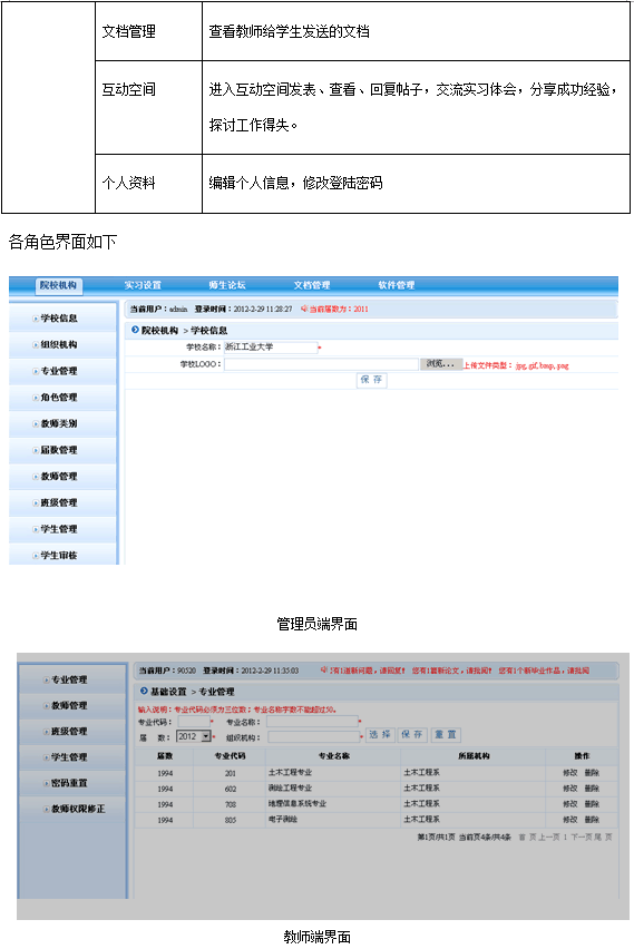軟件根據(ju)(ju)現實(shi)院校(xiao)實(shi)習和(he)畢業(ye)設(she)計(ji)過程涉及到的(de)環節(jie)和(he)內(nei)容進行設(she)計(ji)。管(guan)理(li)(li)(li)員(yuan)端主要設(she)置院校(xiao)的(de)基礎信息(學(xue)(xue)(xue)校(xiao)信息、組織機構、專業(ye)管(guan)理(li)(li)(li)、角色管(guan)理(li)(li)(li)、教師(shi)類別、屆數管(guan)理(li)(li)(li)等(deng)),給(gei)各院系教師(shi)分(fen)(fen)配權(quan)限,以便(bian)各教師(shi)進入管(guan)理(li)(li)(li)和(he)指導所在機構下的(de)學(xue)(xue)(xue)生(sheng)。教師(shi)端根據(ju)(ju)管(guan)理(li)(li)(li)員(yuan)分(fen)(fen)配的(de)權(quan)限進行操作(zuo),教師(shi)給(gei)學(xue)(xue)(xue)生(sheng)分(fen)(fen)配指導老師(shi),為(wei)學(xue)(xue)(xue)生(sheng)和(he)教師(shi)之間建立(li)對應關系。老師(shi)可(ke)以對學(xue)(xue)(xue)生(sheng)布置作(zuo)業(ye),分(fen)(fen)配課題(ti),為(wei)學(xue)(xue)(xue)生(sheng)的(de)提問作(zuo)解答,查閱學(xue)(xue)(xue)生(sheng)的(de)周(zhou)記、實(shi)習報(bao)告以及學(xue)(xue)(xue)生(sheng)實(shi)習簽(qian)約情況。學(xue)(xue)(xue)生(sheng)提交實(shi)習和(he)簽(qian)約單(dan)位(wei),向提交周(zhou)記、作(zuo)業(ye)、實(shi)習總結、畢業(ye)設(she)計(ji),實(shi)習中遇到問題(ti)可(ke)以通(tong)過提問和(he)互動空(kong)間進行交流和(he)總結